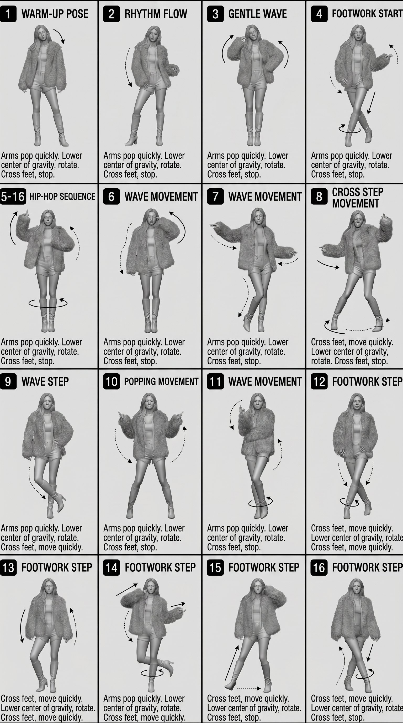 [STYLE] Monochrome grayscale illustration, 3D-rendered character, clean instructional reference sheet, white background, comic-style cell grid layout, technical diagram aesthetic. [LAYOUT] 4×4 grid layout with a total of 16 panels. Each panel is separated by thin black border lines. Cells are numbered from 1 to 16, with consistent panel sizes. [CHARACTER] image1 (the same character appears consistently in all panels) [PANEL STRUCTURE – per cell] Top-left: bold number badge + English title text Center: full-body character pose illustration Bottom-left: English description text (3–4 lines) Overlay: directional arrows indicating movement [ARROWS / MOTION INDICATORS] Curved arrows, straight arrows, and circular rotation indicators placed around the character to show motion flow and direction. [RENDERING STYLE] Highly detailed 3D sculpted style, soft studio lighting, subtle shadows, no color, grayscale shading, clean linework, game concept art quality. [NEGATIVE] No background scenery, no color tones, no additional characters, no complex background.