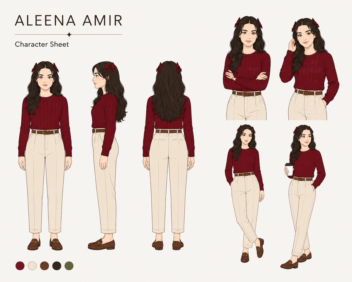 Using the reference image, generate a minimal character sheet of [Name]. Include front, side, and back views with a few simple poses. Flat colors, clean lines, balanced layout, lots of negative space. Modern design style.