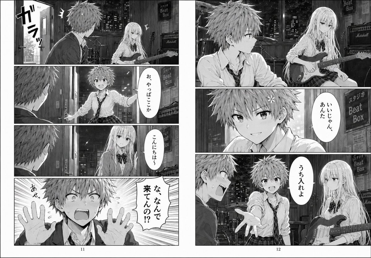 {"type":"black-and-white manga two-page spread","style":{"medium":"monochrome manga screentone illustration","genre":"slice-of-life school music club drama","mood":"surprised reunion at night, quiet tension with comedic shock","reading":"Japanese manga layout, right-to-left feel","rendering":"clean ink lines, detailed hair, soft screentones, dramatic speed lines in the final reaction panel"},"setting":{"location":"small rehearsal studio at night","details":["large windows showing a city skyline with lit buildings","drum kit in the back","guitar amplifier stack including a visible Marshall amp","wall sign reading Studio Beat Box","wood-paneled or dark studio interior","open door leading into the room"]},"characters":{"count":3,"items":[{"role":"male student","appearance":"teenage boy with messy spiky light hair, school shirt with loosened tie, expressive face, average build"},{"role":"female guitarist","appearance":"teenage girl with very long straight light hair and blunt bangs, calm expression, school uniform, seated with an electric guitar across her lap"},{"role":"arriving student","appearance":"teenage student in school shirt and loosened tie, standing in the doorway and later stepping forward with an outstretched hand; face intentionally obscured or simplified"}]},"layout":{"pages":2,"total_panels":8,"page_numbers":[11,12],"sections":[{"title":"left page","position":"left half","count":5,"labels":["top horizontal panel: door bursts open with large sound effect ガラッ, the spiky-haired boy turns toward the entrance while the long-haired girl sits with her guitar in the studio","second panel: over-the-shoulder view of the boy facing the open doorway as the arriving student stands there with one hand on the door and a speech bubble saying おやっはこっか","third panel: the long-haired girl now stands or leans forward near the doorway, smiling gently with a speech bubble saying こんにちは〜","bottom wide reaction panel: the spiky-haired boy recoils in shock with both hands raised, sweat marks, dense speed lines, a large speech bubble saying な、なんで来てんの!? and a smaller exclamation あせっ","background details recurring: studio interior, night skyline, instruments and wall sign"]},{"title":"right page","position":"right half","count":4,"labels":["top row split into 2 panels: close side profile of the spiky-haired boy looking right, and the long-haired girl seated with her electric guitar in a calm pose","middle horizontal panel: closer view of the boy speaking with a speech bubble saying いいじゃん、あんじん","bottom wide panel: the arriving student reaches a hand toward the boy while standing beside the guitarist, the boy shouts in alarm, and a large speech bubble says うち入れよ","background details recurring: Beat Box sign, amp stack, drum kit, city lights outside"]}],"gutter":"thick white manga gutters separating the panels"},"text":{"visible_japanese":["ガラッ","おやっはこっか","こんにちは〜","な、なんで来てんの!?","あせっ","いいじゃん、あんじん","うち入れよ","Studio Beat Box","Marshall"]},"composition":"create an authentic printed manga spread with cinematic panel variety, alternating medium shots, over-the-shoulder views, close-ups, and one exaggerated comedic reaction panel; keep the female guitarist serene, the male lead increasingly flustered, and the newcomer casual and intrusive; emphasize nighttime atmosphere through the windowed skyline and rehearsal-room equipment.","parameters":{"headline":"{argument name=\"headline text\" default=\"音が違った日\"}","male_hair":"{argument name=\"hair color\" default=\"light ash blond\"}","guitar_type":"{argument name=\"guitar model\" default=\"black Stratocaster-style electric guitar\"}","studio_name":"{argument name=\"studio name\" default=\"Beat Box\"}","city_time":"{argument name=\"time of day\" default=\"night\"}"}}