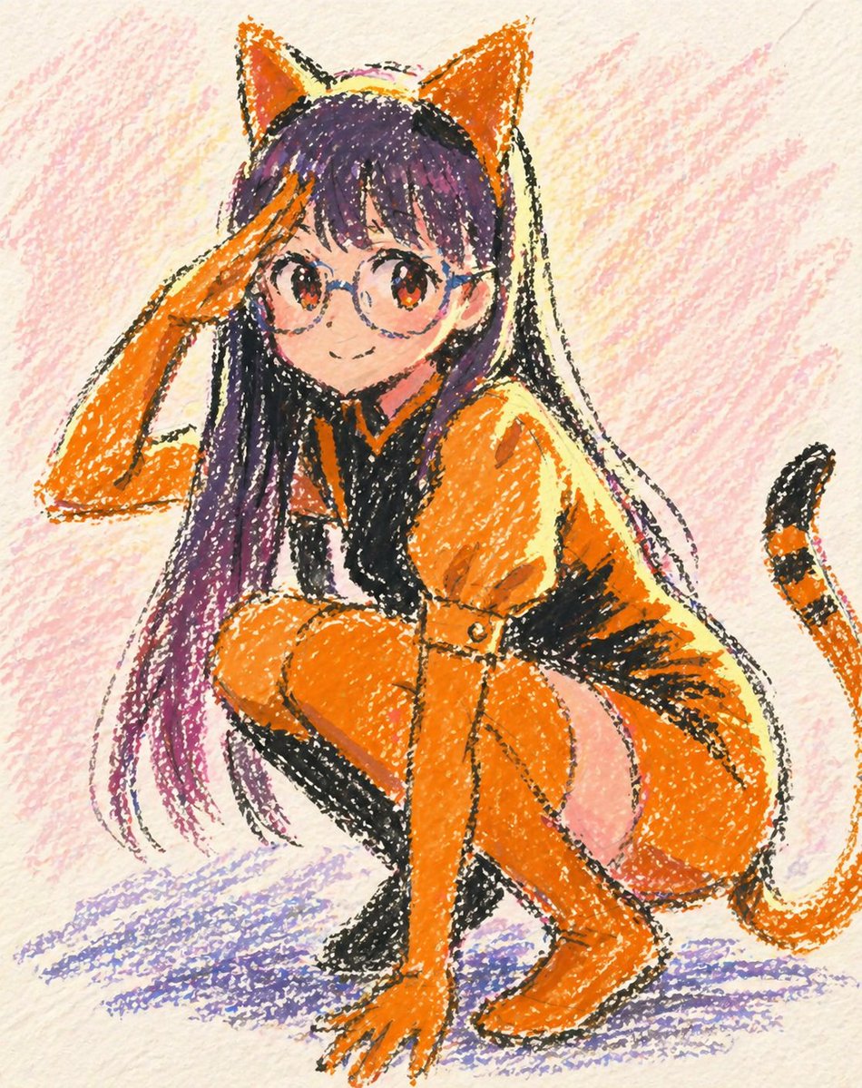 A cute anime catgirl crouching low in a playful pose, drawn as a hand-made oil pastel illustration on textured off-white paper. She has long straight {argument name="hair color" default="deep purple with lighter lavender ends"} hair, large pointed orange cat ears on top of her head, and a striped orange-and-black cat tail curving in from the right side. Her outfit is a tiger-inspired bodysuit in vivid {argument name="outfit color" default="bright orange"} with bold black accents: long fitted sleeves, a dark black chest and torso panel, orange legs, orange gloves, and a soft pale pink patch on the hip and upper thigh area. She is squatting with one knee raised, one hand touching the ground in front of her, and the other hand lifted in a salute near her forehead, facing the viewer with a mischievous, energetic feel. Render the whole image in rough crayon-like oil pastel strokes with visible grain, uneven sketchy black outlines, scribbled color fill, and childlike analog texture. Use a warm pastel palette with orange as the dominant color, purple hair, soft pink scribbled background shading, and a purple-blue scribbled shadow beneath her. Keep the composition as a single centered full-body character on paper, whimsical, charming, slightly messy, and irresistibly cute, like an expressive pastel doodle illustration.