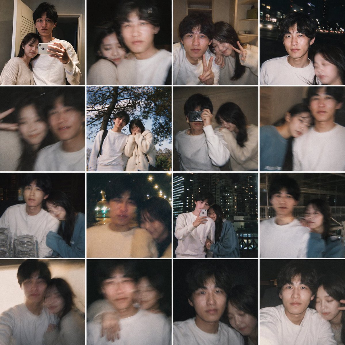 Using the provided reference image as the base for the man, transform it into a realistic casual smartphone photo collage showing him as if he has a girlfriend. Keep his identity, hairstyle, age, white sweatshirt, and candid non-model look consistent, but place him together with a young woman across 16 square snapshots arranged in a 4x4 grid with thin white borders. Add exactly 1 recurring female companion with long dark hair, styled like a real person rather than a glam model, and vary her outfits subtly across the collage, including a cream knit cardigan, a dark top, and a muted blue top. Make the photos feel like authentic couple memories shot on a phone: close mirror selfie together, dark blurry selfie, indoor peace-sign selfie, night street selfie, motion-blur closeup, outdoor daytime shot under a tree, indoor shoulder-leaning shot, another blurry affectionate shot, seated restaurant shot with glasses on the table, warm night bokeh shot, rooftop or balcony mirror selfie with city lights, nighttime urban walking shot, cozy leaning-together shot, shoulder-around pose, close side-by-side portrait, and another intimate close crop. Mix indoor home scenes, nighttime city scenes, one daytime outdoor scene, and one restaurant setting. Use imperfect framing, slight blur, flash, grain, and spontaneous candid composition so it feels like a real person's saved couple photo dump, not a polished campaign.