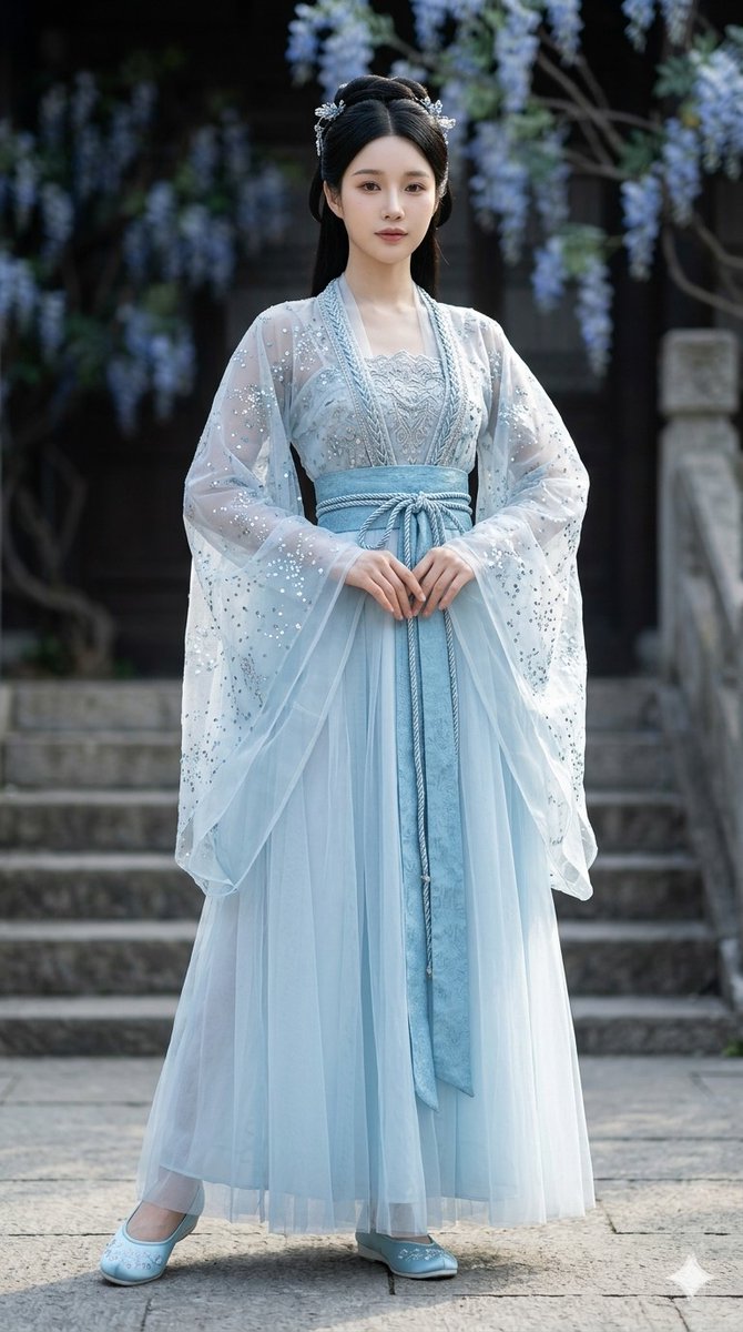[中文] 服裝細節: 模特兒身穿一套精緻的淡冰藍色齊胸襦裙,採用多層輕盈的薄紗和絲綢歐根紗材質制成。其寬大的、半透明的廣袖上點綴著如繁星般微小的銀色和淺藍色亮片刺繡,在光線下閃爍(具有銀河般的夢幻感)。抹胸位置有複雜的銀色蕾絲和編織紋理細節,腰帶自然垂落。 材質與光影: 畫面呈現 8k 超高分辨率和對織物微距紋理的極致渲染。光線採用柔和的自然側光(丁達爾效應 Typndall Effect),精準地透射過輕薄的紗布,營造出面料的半透明感(Translucency)和流動感。 構圖與鏡頭: 採用 85mm 黄金人像鏡頭效果,f/1.8 大光圈,全身構圖,模特居中站立 [English] Clothing details: The model wears an exquisite pale ice blue chest-high ruqun, made of multiple layers of lightweight tulle and silk organza materials. Its wide, translucent broad sleeves are adorned with tiny silver and light blue sequin embroideries like stars, shimmering under the light (with a galaxy-like dreamy feel). The tube top position has complex silver lace and woven texture details, and the belt falls naturally. Material and light and shadow: The image presents 8k ultra-high resolution and extreme rendering of macro textures of the fabric. The lighting uses soft natural side light (Tyndall Effect Typndall Effect), accurately transmitting through the light gauze, creating a sense of translucency (Translucency) and fluidity of the fabric. Composition and lens: Uses 85mm golden portrait lens effect, f/1.8 large aperture, full-body composition, model standing in the center