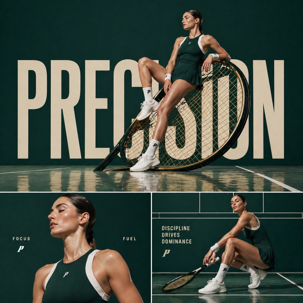 Cinematic sports fashion collage, 3-panel layout, top panel large hero shot of a female tennis athlete sitting confidently on an oversized tilted tennis racket, deep green luxury court backdrop, reflective glossy floor, bold oversized typography “PRECISION” in background, dramatic editorial lighting, ultra-clean composition, high-fashion athletic aesthetic. Bottom left panel: close-up portrait of the athlete with glowing skin, minimal makeup, soft light, text “FOCUS” and “FUEL” placed subtly. Bottom right panel: full-body crouched pose holding racket, strong posture, text “DISCIPLINE DRIVES DOMINANCE”, grid-based layout lines, premium sports branding feel. Consistent color grading, dark green and white palette, sharp details, cinematic shadows, luxury campaign style, 1:1 aspect ratio.