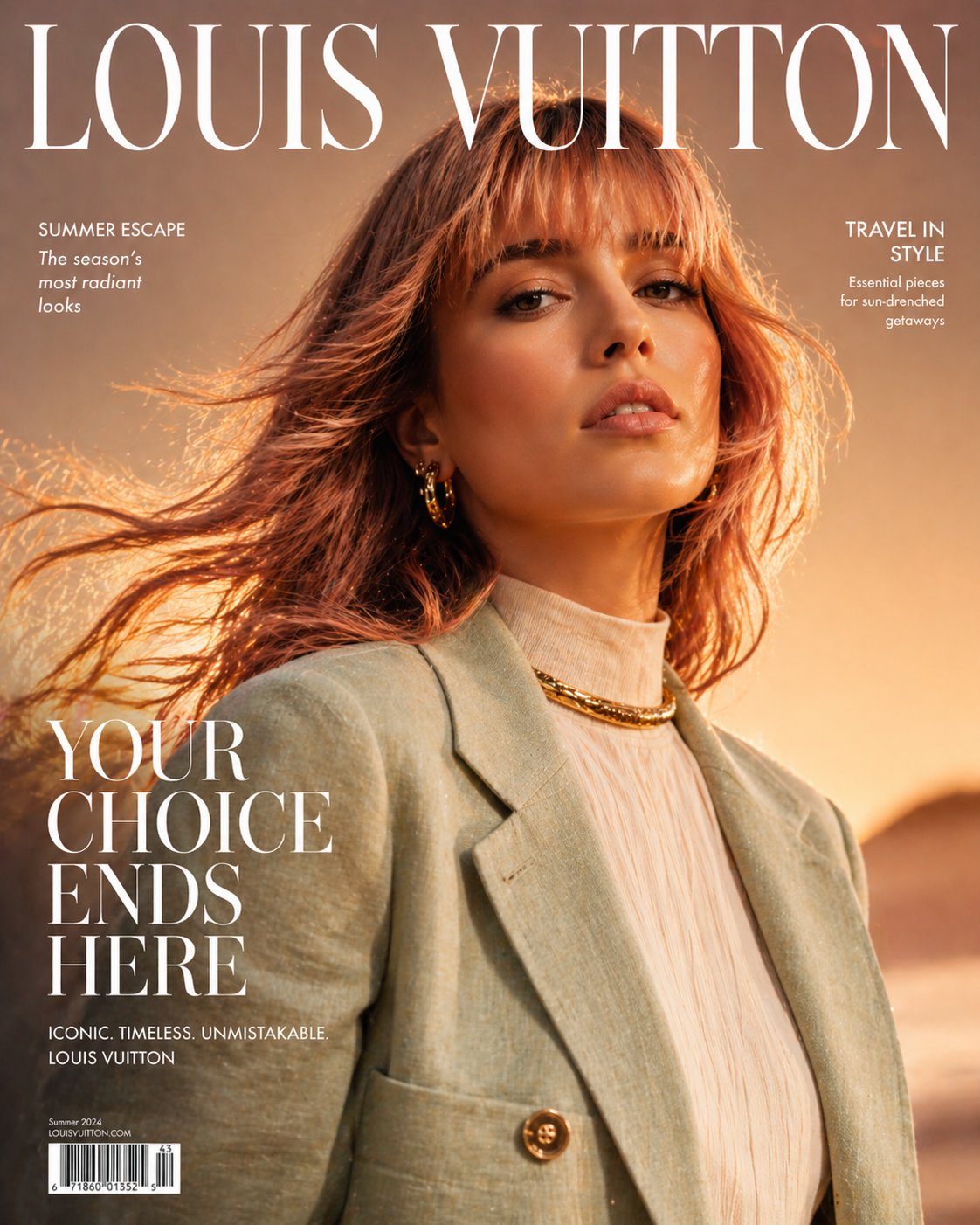 Ultra high-fashion magazine cover, Louis Vuitton-style editorial. Close-up portrait of a confident woman with soft rose-gold hair and natural airy bangs, slightly wind-blown for movement. She is wearing a luxury summer outfit: a structured lightweight linen or silk jacket in warm golden-yellow tones, layered over a modest high-neck top, paired with a bold gold choker necklace and subtle statement earrings. Fabric flows naturally with a summer breeze, slightly textured and breathable, capturing a premium seasonal feel. Styling is elegant, modest, and refined — no revealing clothing. Lighting is high-end studio mixed with natural golden hour glow: warm highlights, soft shadows, luminous skin with glossy editorial finish. Background is a rich summer gradient (sunset gold fading into soft coral or warm beige), clean but visually striking. Composition is dynamic and slightly cinematic: hair in motion, shallow depth of field, sharp focus on face. Typography: large elegant serif masthead "Louis Vuitton" at the top, bold cover line "YOUR CHOICE ENDS HERE" in premium editorial layout, minimal supporting text. Ultra-realistic, hyper-detailed skin texture, 8K resolution, sharp focus, glossy magazine print quality, cinematic color grading, luxury fashion photography, no nudity, tasteful and editorial.