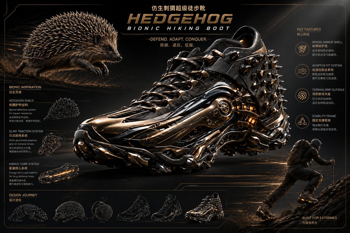 Extreme futuristic {argument name="inspiration" default="hedgehog-inspired"} bionic {argument name="item" default="hiking boot"}, fusion of rugged outdoor gear and armored creature design, spiked protective shell structure, layered carbon fiber plates, adaptive grip sole with claw-like traction, subtle glowing energy core, {argument name="color scheme" default="black and bronze luxury finish"}, built for extreme terrain, dramatic low angle, cinematic lighting, high-end outdoor gear advertisement, ultra detailed, 8k