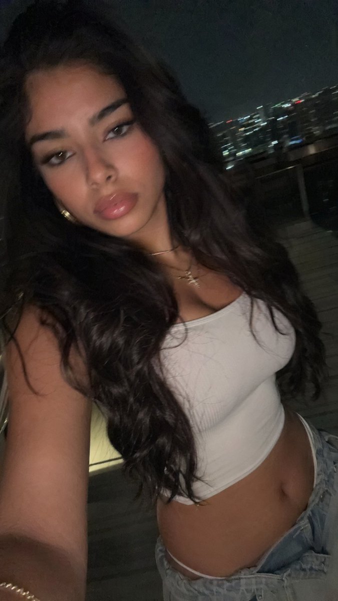 A candid nighttime balcony selfie of a young woman shot from a slightly high handheld phone angle, with the face mostly obscured by shadow and framing, emphasizing the outfit and mood rather than facial detail. She has {argument name="hair color" default="dark brown"} long loose wavy hair falling over both shoulders, medium tan skin, and wears 2 delicate gold necklaces, one a thin chain and one with a small cross pendant, plus a subtle bracelet on the wrist visible near the bottom edge. Her outfit is a fitted white sleeveless cropped tank top and {argument name="bottoms" default="light blue low-rise denim jeans"}, revealing the midriff. The pose is relaxed and slightly leaning, one arm extended to hold the phone, with a casual going-out aesthetic. Set the scene on a modern apartment balcony at night with a glass railing and a blurred distant city skyline filled with small bokeh lights. Use dim ambient lighting with a direct phone flash that illuminates the torso and hair, creating strong contrast, soft grain, slight motion blur, and an authentic late-night social-media selfie look. Vertical smartphone composition, close crop from upper chest to hips, realistic photography, moody, intimate, unpolished, natural proportions.