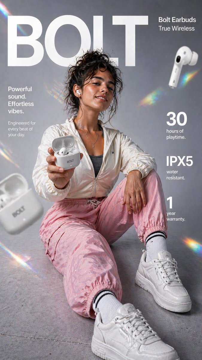 Create a high-impact 9:16 vertical e-commerce infographic for {argument name="product name" default="Bolt True Wireless Earbuds"} with a premium lifestyle advertising aesthetic. Composition & Framing Full-body shot of a young woman (match face and identity exactly to the provided reference image — accurate facial features, skin tone, hairstyle) Camera angle slightly low and close (fashion campaign perspective) to add depth and presence The subject is sitting casually on the floor, one knee raised, one leg extended forward toward the camera Foreground (Product Focus) The woman is holding an open {argument name="brand" default="Bolt"} earbud charging case toward the camera Inside the case: one earbud visible The second earbud is worn in her ear Case should be glossy white with subtle branding (“BOLT”) Add slight macro depth-of-field blur on the hand and case for cinematic realism Subject Styling Outfit: modern sporty streetwear lightweight jacket (off-white / neutral tone) crop top or sports bra loose joggers (light pink or soft color) white sneakers with visible texture Expression: confident, relaxed, slight smile Pose: natural, lifestyle-oriented — not stiff or overly posed Background & Atmosphere Clean studio background with soft gray gradient Add: rainbow prism lens flares subtle light leaks floating blurred earbuds and charging case in background Ground surface slightly textured (studio floor look) Lighting Soft, diffused commercial lighting Highlight: skin texture glossy earbud case fabric details Subtle rim lighting for separation from background Typography Layout (Modern Sans-Serif, White) Top Center (Behind Model): BOLD HUGE TEXT: “BOLT” (partially hidden behind subject) Top Right: Bolt Earbuds True Wireless Mid Left: Powerful sound. Effortless vibes. Engineered for every beat of your day. Mid Right: BIG: 30 small: hours of playtime Below that: BIG: IPX5 small: water resistant Bottom Right: BIG: 1 small: year warranty Style & Quality 8K ultra-realistic commercial photography Sharp focus on face + earbuds Slight depth blur for foreground and background elements Clean Apple/Nike-style premium ad aesthetic Balanced composition with strong negative space