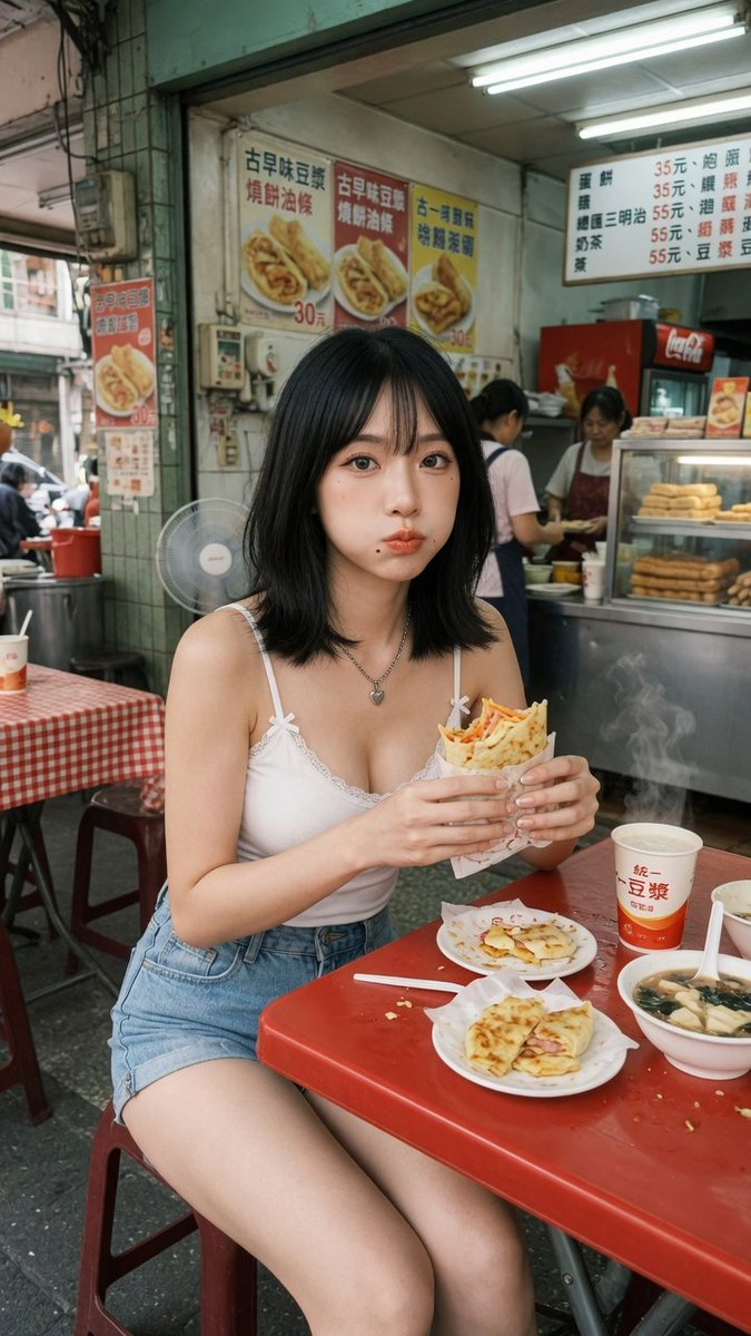 A candid street-food cafe photo in a narrow old Taiwanese breakfast shop, shot in a realistic smartphone-photo style with soft natural daylight and a slightly warm documentary look. A young East Asian woman with {argument name="hair color" default="black"} shoulder-length straight hair sits on a small red plastic stool at a red laminate table, facing the camera and holding a hot scallion pancake wrap with both hands at chest height. Her face is intentionally obscured with a large soft blurred rectangle. She wears a white camisole with thin straps and tiny bow details, light blue high-waisted denim shorts, and a silver heart pendant necklace. Her pose is relaxed, seated slightly angled, with bare legs visible under the table. On the table are exactly 2 white plates of sliced stuffed scallion pancakes, 1 steaming paper cup with red Chinese text, 1 white bowl of soup with dark greens and tofu or curd pieces and a white soup spoon, plus scattered crumbs and paper wrappers. Steam should be clearly rising beside the cup and bowl. The food wrap in her hands looks overstuffed with egg, scallion pancake layers, and fillings peeking out. The background shows a busy, authentic local eatery interior: exactly 2 workers behind a glass display case, a Coca-Cola refrigerator, fluorescent tube lights overhead, an electric fan, tiled walls, and several Chinese menu signs and food posters with prices in New Taiwan dollars. Include visible traditional Chinese signage such as scallion pancakes, egg pancake rolls, soy milk, and prices around 30 to 55 yuan/TWD. Show a glass case on the right containing stacked fried dough sticks or pastries. On the left side, reveal part of the open storefront to the street with scooters and neighboring buildings faintly visible. Composition is vertical, full-body seated crop from head to knees, centered subject, shallow depth of field but enough detail to keep the shop readable, realistic skin tones, casual morning breakfast atmosphere, bustling everyday Taipei street-food aesthetic.