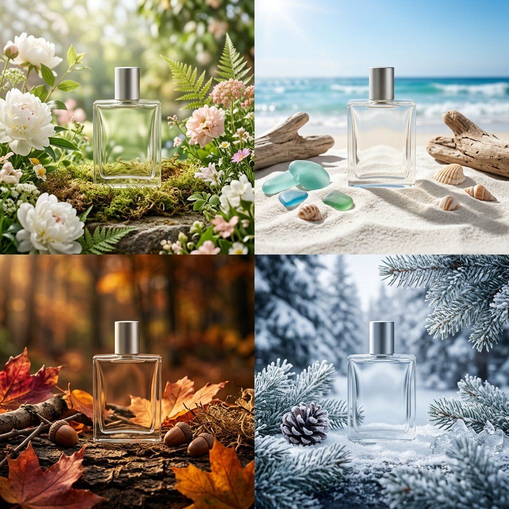 PHASE 1 - PRODUCT: [ITEM] in [MATERIAL] packaging, minimal label design PHASE 2 - GRID: 2x2 seasonal grid, four distinct brand worlds PHASE 3 - COMPOSITION: each quadrant a full campaign scene with props and environment PHASE 4 - CONSISTENCY: same product silhouette, four distinct palettes Swap: [ITEM] / [MATERIAL] / [LABEL STYLE]