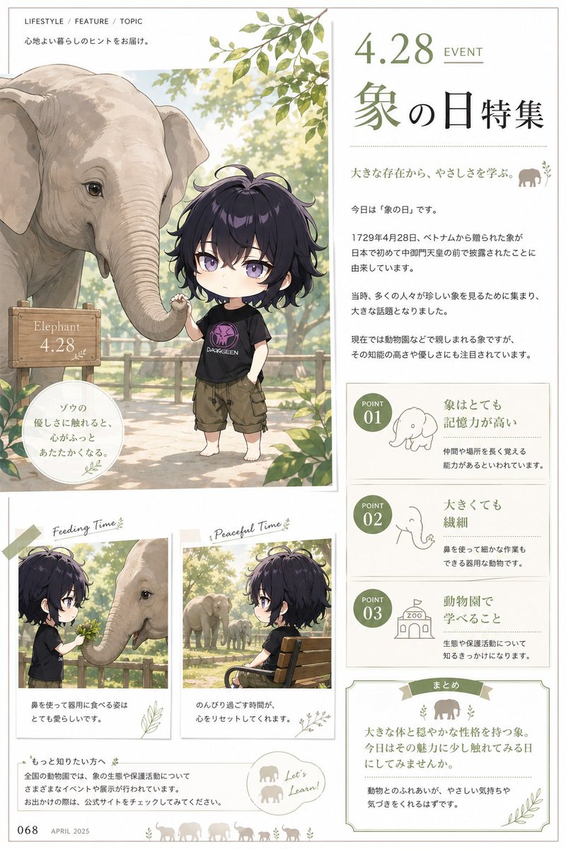 Create a soft, elegant Japanese lifestyle magazine editorial page in a warm botanical watercolor style, formatted as a full-page A4 portrait layout with a cream paper background, thin beige border, muted sage-green accents, and a refined nature-themed design. The page is a single cohesive magazine spread design with 6 distinct content sections: 1 large main illustration panel on the left, 1 tall title-and-article column on the upper right, 3 stacked informational point boxes on the mid-to-lower right, 2 small photo-card style image panels along the lower left, 1 circular quote badge near the lower left of the main panel, and 1 summary box at the lower right. The theme is elephant appreciation day in Japan. At the top left, place small editorial header text reading "LIFESTYLE / FEATURE / TOPIC" with a short Japanese subtitle beneath it. Across the upper right, add the large date heading "4.28 EVENT" and the main Japanese headline "象の日特集" in an elegant serif style, with a short subheading line beneath it and a tiny elephant icon. Below that, set 3 short Japanese body paragraphs in a clean magazine column, explaining elephant day. The main illustration panel shows a gentle elephant standing on the left, rendered in delicate watercolor with realistic wrinkles, large ears, soft ivory-gray skin, and a lowered trunk reaching toward a small child standing beside it. The child is an androgynous anime-style boy with messy wavy dark purple-black hair, pale skin, large eyes, a black graphic T-shirt with a purple emblem, loose brown knee-length cargo shorts, and bare feet, standing casually with one hand in a pocket while touching the elephant’s trunk with the other. Behind them is a sunny zoo walkway with a wooden fence, soft green trees, dappled light, and leafy branches hanging from above. Near the elephant, include a small wooden sign reading "Elephant 4.28". Add a circular text badge in Japanese near the lower left of the main image. On the lower left area, place exactly 2 small bordered snapshot-style panels with taped-corner scrapbook presentation: the first labeled "Feeding Time" showing the child in side profile offering leaves to the elephant’s trunk across a fence; the second labeled "Peaceful Time" showing the child seated on a wooden bench in profile with elephants in the background, in a calm reflective scene. Each small panel has a short Japanese caption underneath. On the right side, stack exactly 3 informational boxes labeled "POINT 01", "POINT 02", and "POINT 03" in olive green circles, each with a simple line icon and Japanese text: box 1 features an elephant icon and discusses memory, box 2 features a trunk or elephant-face icon and discusses delicacy despite size, box 3 features a zoo building icon and discusses what can be learned at the zoo. At the bottom right, add 1 bordered summary box with a ribbon-like header reading "まとめ", a small elephant silhouette, and 2 short Japanese summary paragraphs. Along the bottom margin, include the page number "068", the date "APRIL 2025", and a row of small walking elephant silhouettes. Add subtle botanical flourishes, leaves, and light decorative strokes throughout. Overall mood: gentle, educational, heartwarming, airy, natural, child-friendly, and sophisticated, like a premium seasonal magazine feature.